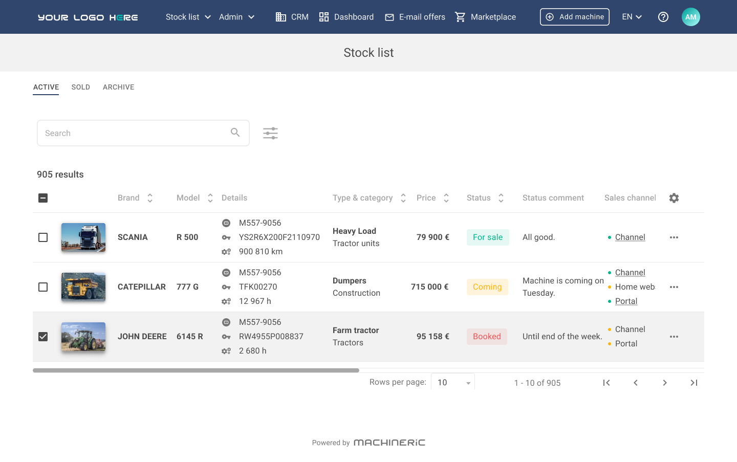 Machineric tillhandahåller omfattande programvara för verkstadshantering av tung utrustning och lösningar för återförsäljarhantering. Vår marknadsplats för tung utrustning och programvara för industriella auktioner effektiviserar försäljning, auktioner och lagerhantering, vilket gör det möjligt för återförsäljare att nå fler köpare och avsluta affärer snabbare. Bygg din marknadsplats för tung utrustning med fullständig varumärkeskontroll.